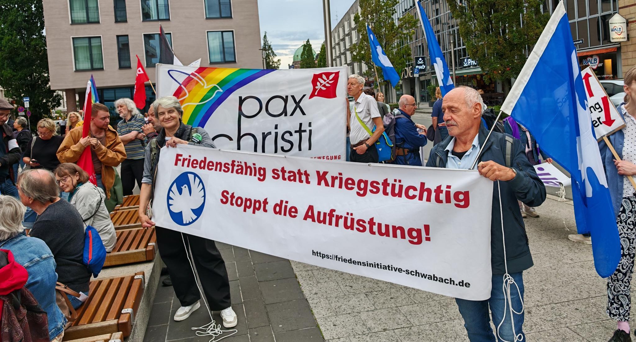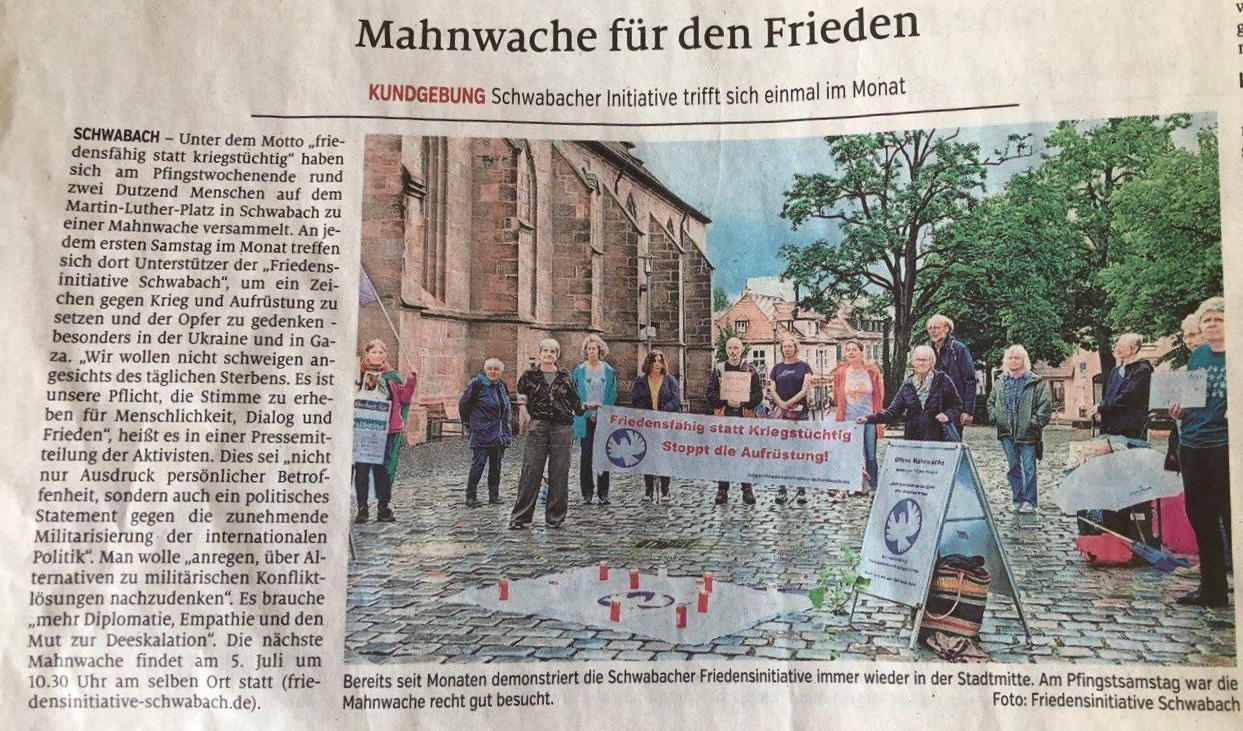 am Samstag, den 4. April 2026, um 10:30 Uhr versammeln wir uns erneut zur Mahnwache auf dem Martin-Luther-Platz in Schwabach, um ein kraftvolles und unübersehbares Zeichen für den Frieden zu setzen. Um 10.30 Uhr findet ein Schweigekreis für ca. 30 Minuten statt.