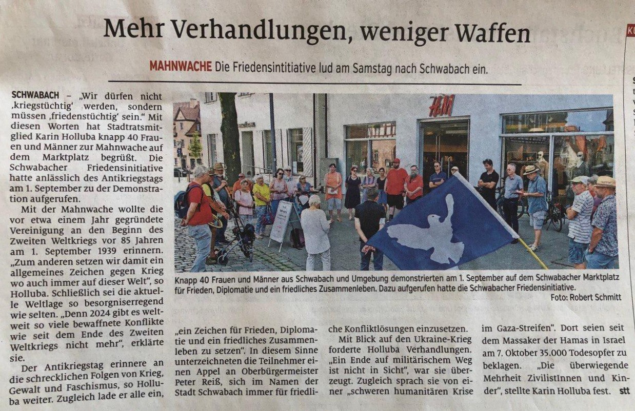 Wir sind Schwabacherinnen und Schwabacher oder kommen aus Orten in der Umgebung. Wir setzen uns für eine friedliche Lösung von Konflikten ein und sprechen uns gegen alle Kriege, Aufrüstung und Waffenexporte aus. Einmal im Monat – in der Regel am ersten Samstag des Monats – führen wir eine Mahnwache im Schweigen in Schwabach durch und bauen eine Infostand auf. Manche von uns nehmen auch an Demonstrationen in anderen Orten teil. Wir freuen uns sehr über neue Friedensbewegte – Kommen Sie gerne vorbei!